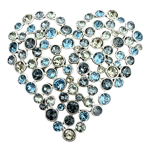 Oscar de la Renta Multi-Blue Austrian Crystal Open-Work Heart Brooch, 3” x 2.75”