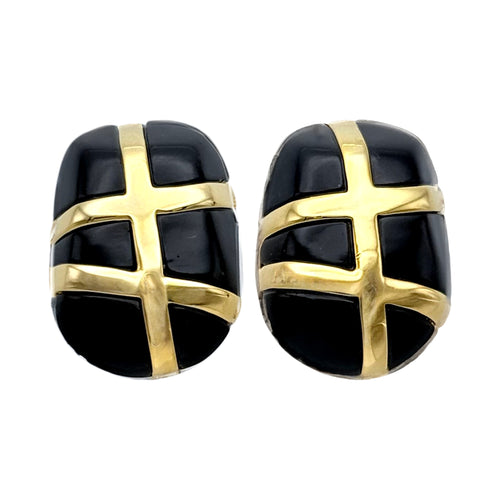 Kenneth Jay Lane 22k Gold Plated Black Resin Clip Earrings with Cross Band Motif