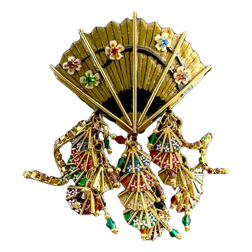 Lunch at The Ritz Asian Fan Brooch with Dangling Multi-Color Fans Gold Plating