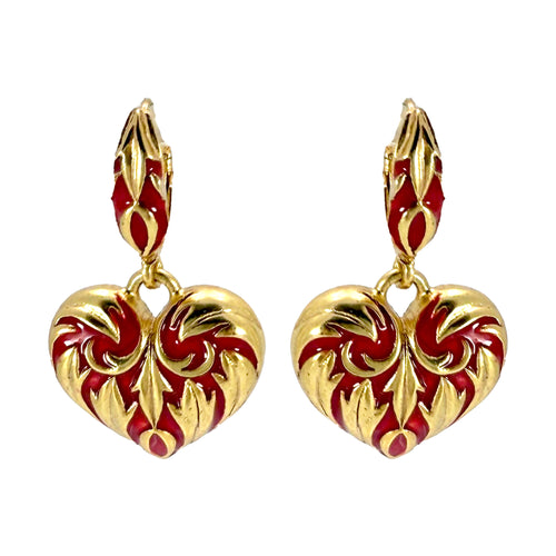 Oscar de la Renta Red Heart Romantic Enamel and Gold Plated Leverback Earrings