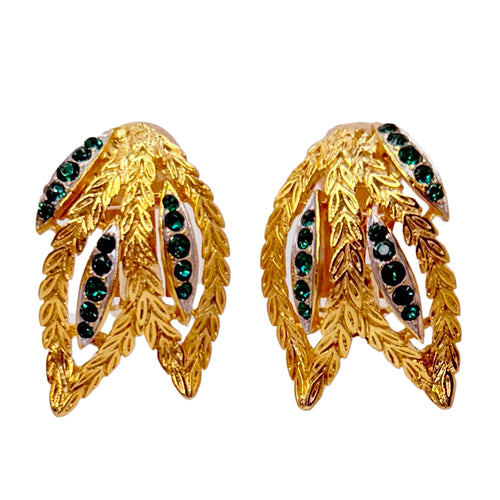 Kenneth Jay Lane Triple Leaf Emerald Crystal Clip-On Earrings 22K Gold-Plated