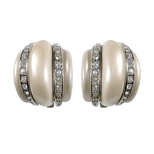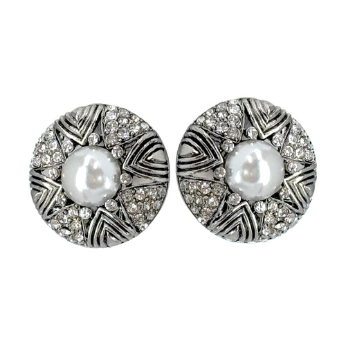 Kenneth Jay Lane Silvertone Art Deco Crystal Pavé Pearl Clip-On Button Earrings