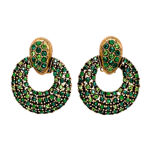 Oscar De La Renta Emerald Green Gold Swarovski Crystals Doorknocker Clip Hoops
