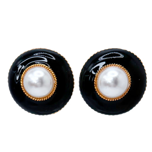 Kenneth Jay Lane 22K Gold Black Enamel Pearl Cabochon Button Clip-On Earrings