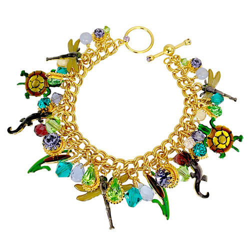 Lunch at The Ritz™ Dragonfly Lizard Turtle 22k Gold Plated Charm Bracelet 7"