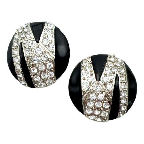 Kenneth Jay Lane Silver Plated Black Enamel Clip Earrings with Crystal Zigzag