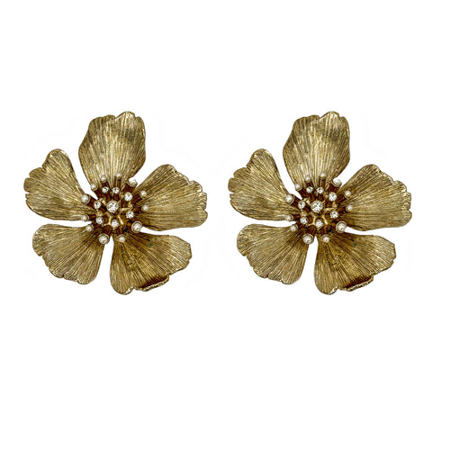 Oscar De La Renta Antique Gold Wild Rose Pearl Swarovski Crystal Clip Earrings
