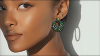 Oscar de la Renta emerald green gold Swarovski crystal doorknocker clip hoop earrings. Luxury designer jewelry. 1.5" statement pieces. Made in USA.