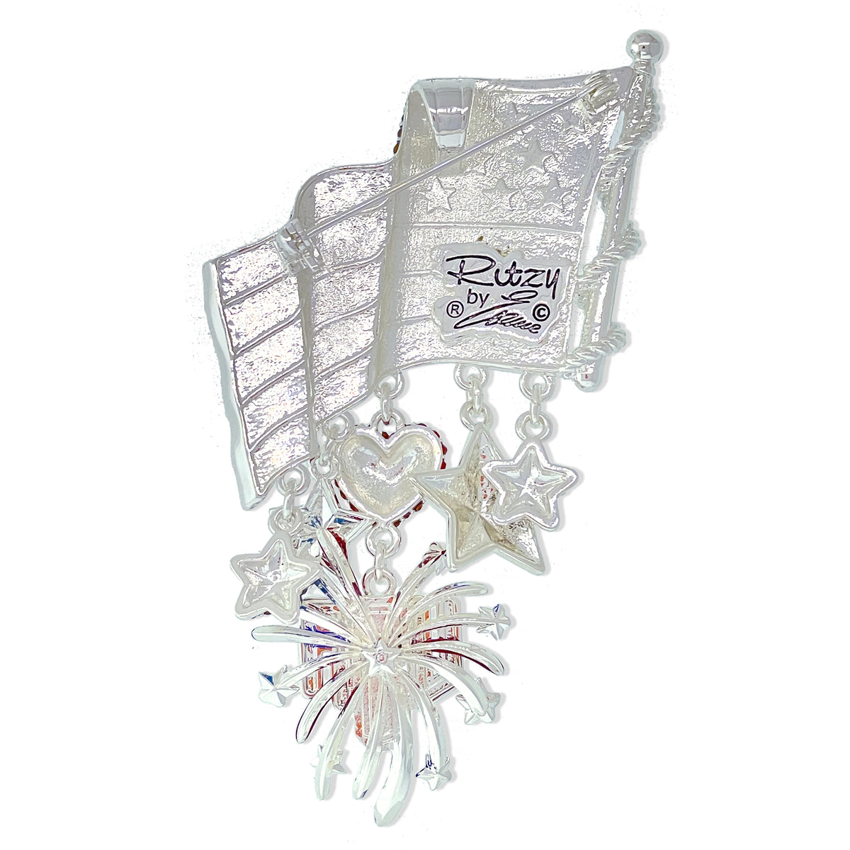 Looking for a fun and festive way to fly your flag this 4th of July? Look no further than the Exqisite July 4th Fireworks Flag Brooch by Ritzy Couture DeLuxe! This gorgeous pin has a bail on the back and can be worn as a pendant. It' plated in Fine Silver and features a dazzling array of firework-inspired beads and charms. It's the perfect accessory for any Fourth of July celebration, whether you're soaking up the sun at a BBQ or watching the fireworks light up the night sky. So show your pride in America this Independence Day with the Exquisite July 4th Fireworks Flag Bracelet Ritzy Couture DeLuxe!