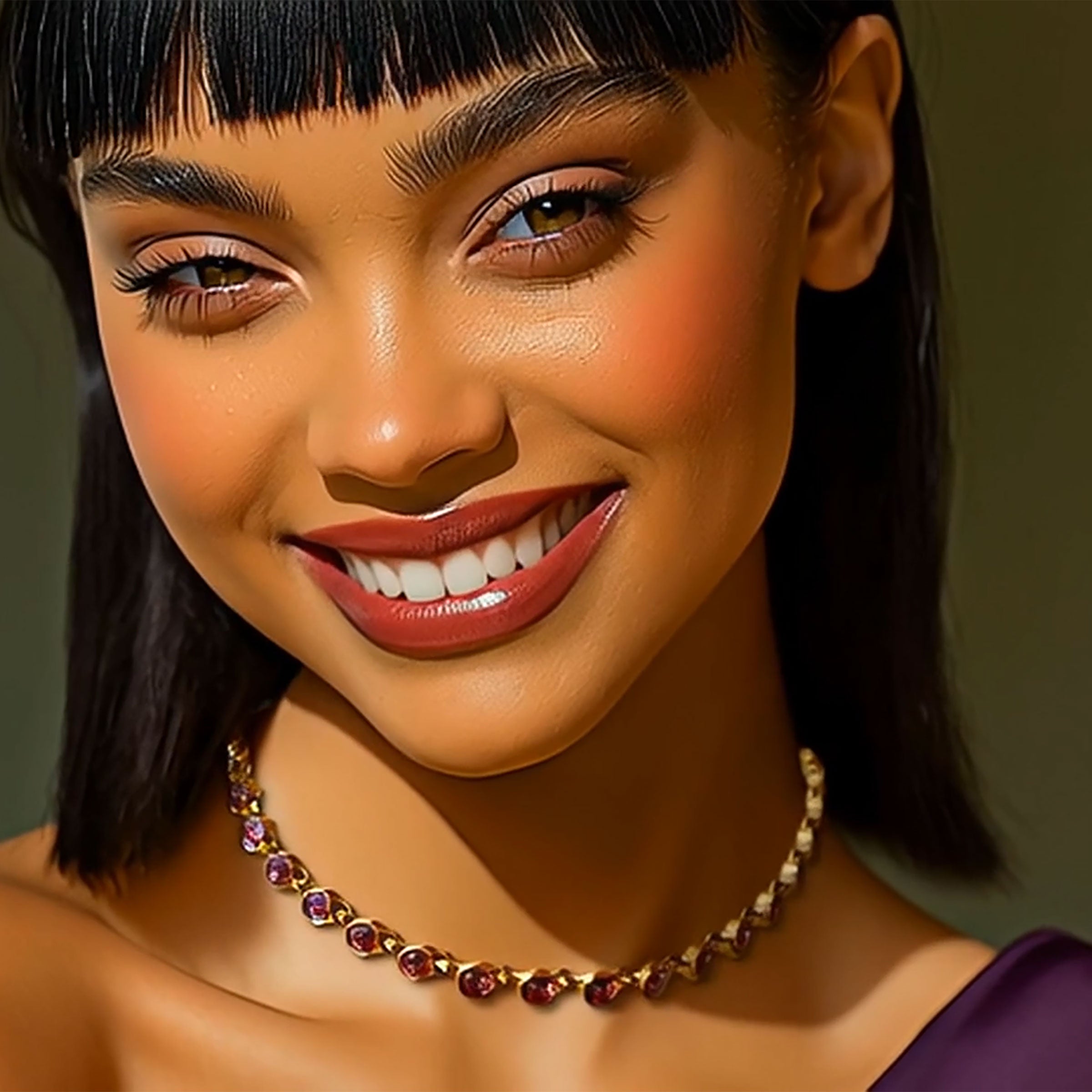 Each Oscar de la Renta crystal measures approximately 6mm diameter in individual gold bezels, with the complete necklace weighing 35 grams. The generous 4.5-inch extender chain allows adjustment from 16 to 20.5 inches, making this luxury designer necklace versatile for various necklines and occasions. These Swarovski crystal settings feature deep tanzanite violet tones ranging from rich purple to blue-violet iridescence.