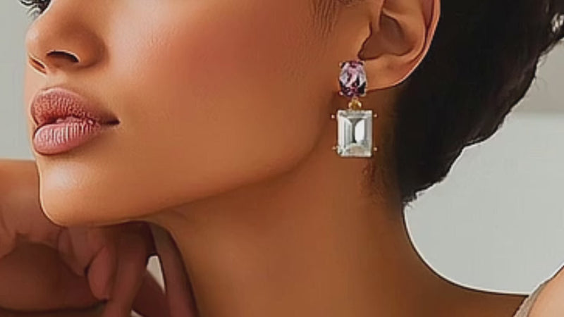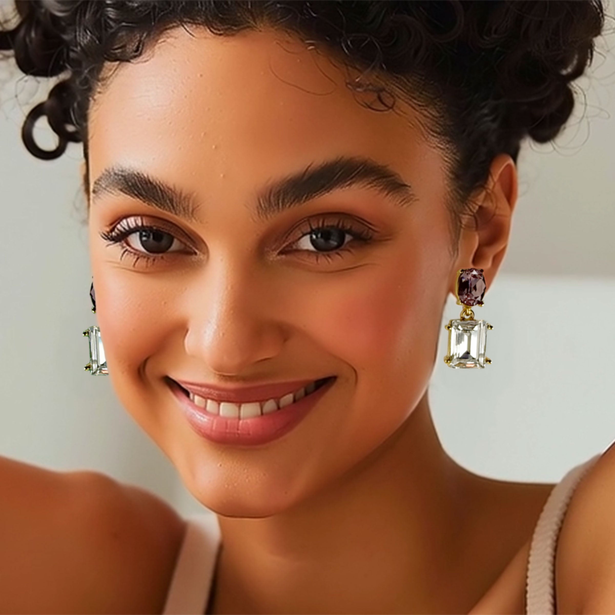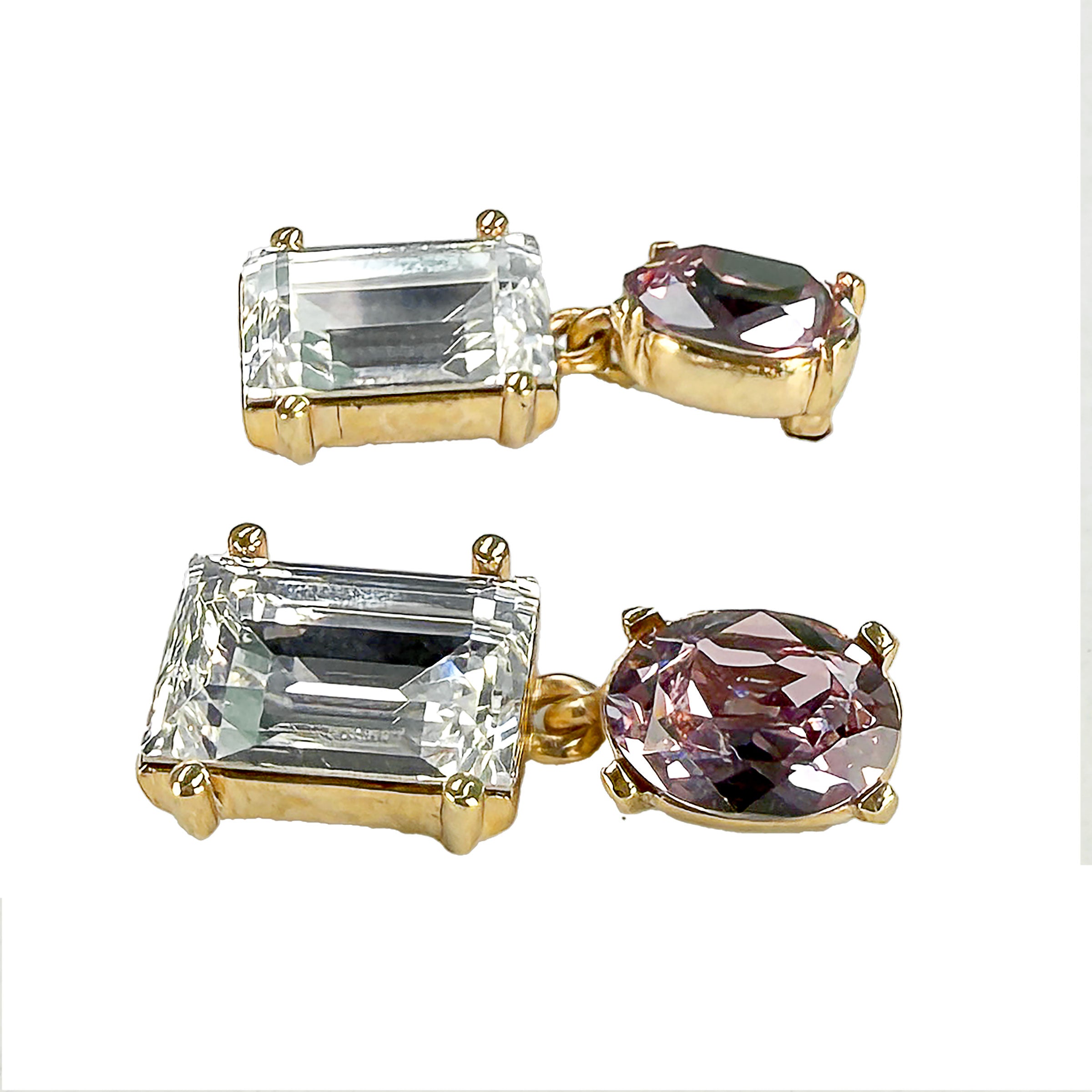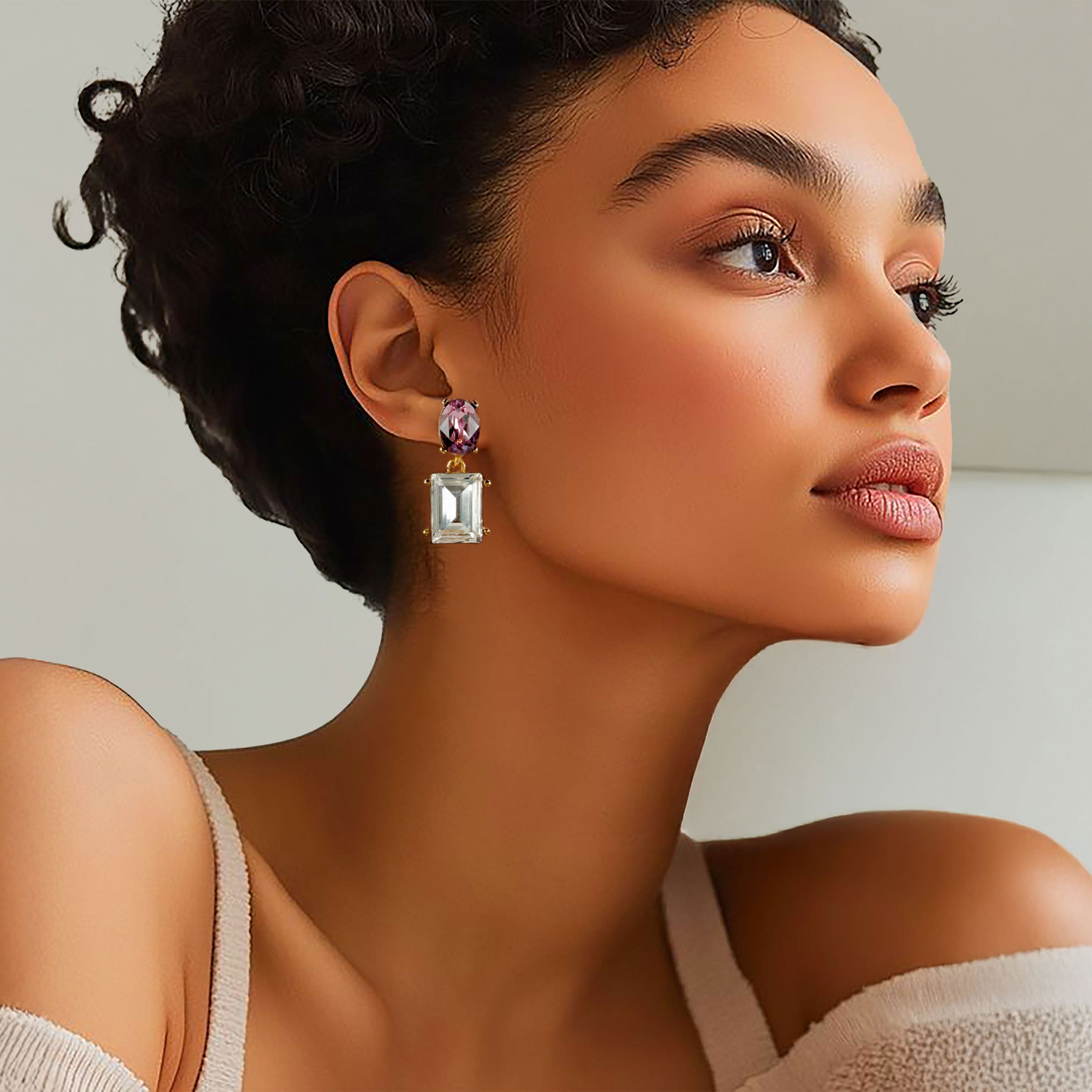 These refined Oscar de la Renta post earrings feature dual Swarovski crystal design with light amethyst oval crystals paired with clear emerald-cut rectangular crystals below. Hand cast original components in mixed metals and brass with rich 22k gold plating create brilliant prong settings. Each earring measures 1.5 inches in length by 0.5 inches wide with 0.25-inch depth, creating beautiful dimensional drop silhouette. The two-stone design captures light through faceted crystal surfaces, with purple-pink amethyst tones complementing clear crystal brilliance below.
