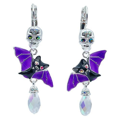 Halloween Bat Wing Skull Leverback Earrings Ritzy Couture DeLuxe-Fine Silver Plated