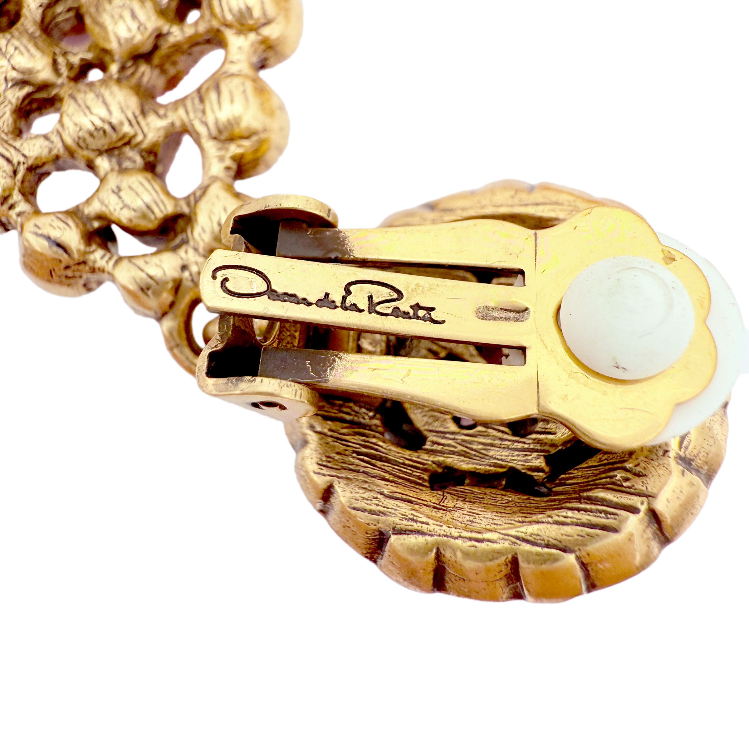 Original samples in new unworn condition represent authentic contemporary fashion jewelry from this prestigious American luxury house. Designer statement earrings bear "Oscar de la Renta" signatures on clips and "Made in USA" on backs, exemplifying premium Swarovski crystal craftsmanship.