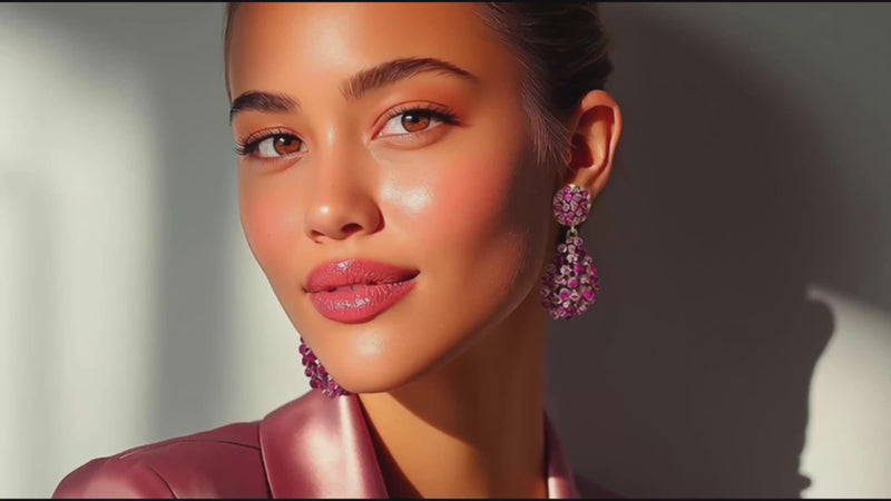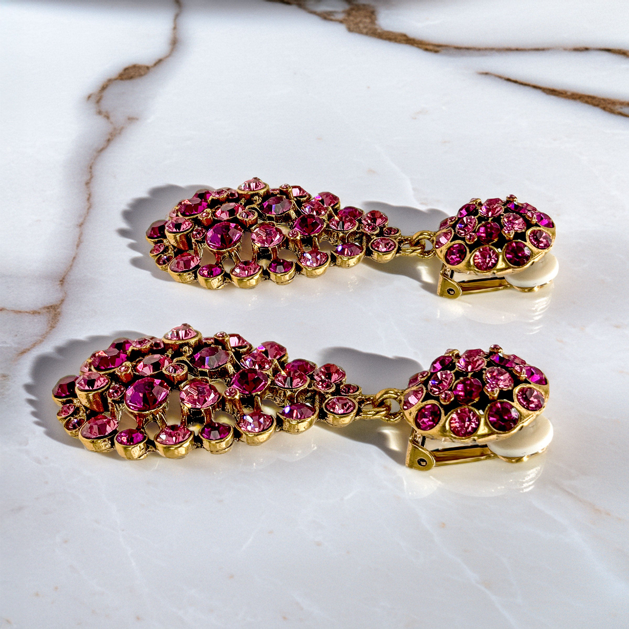 Each Oscar de la Renta pear drop earring measures 2.75 inches length by 1.25 inches width, weighing 22 grams per earring. The elegant proportions make these luxury designer earrings perfect for those who appreciate refined statement jewelry, while secure Oscar de la Renta clip mechanisms accommodate non-pierced ears comfortably. These Swarovski crystal drop earrings feature gorgeous pink tones from soft rose to deep fuchsia magenta.
