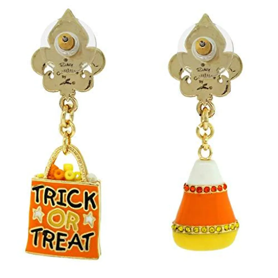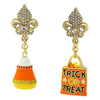 "Candy Corn & Trick or Treat" Halloween Asymmetrical Charm Leverback Earrings (Goldtone) Ritzy Couture. Sport these spooky Jack O' Lantern earrings for a truly bewitching look! One eerie earring showcases a sparkly Trick or Treat bag drop with a Candy Corn right beside it. Both earrings in this pair are accented with rhinestones and feature a faceted colored bead dangling at the bottom. You'll surely make a bold and bootiful statement at every Halloween party you attend.