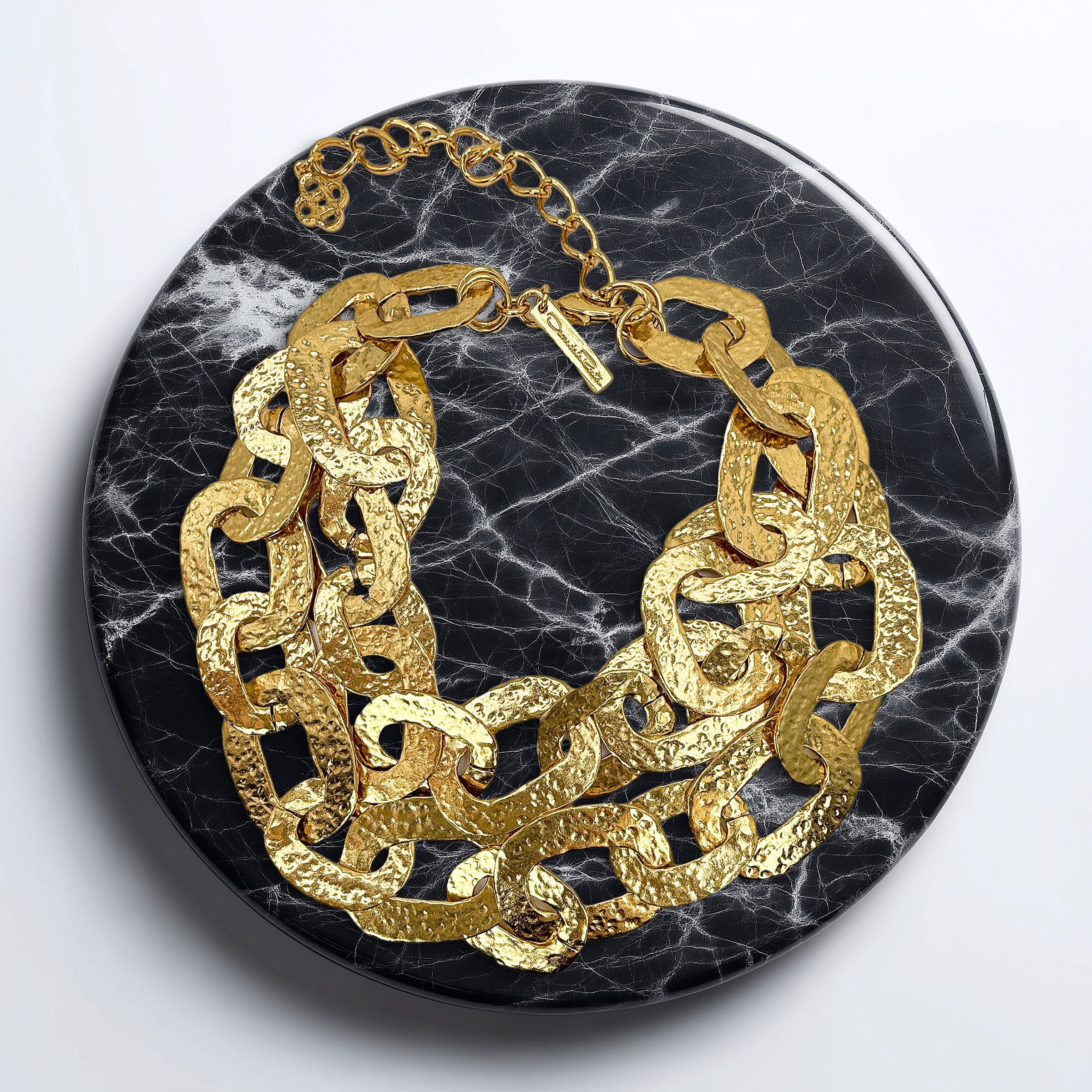 Oscar de la Renta 22k gold plated hammered chain link collar necklace showcases commanding luxury designer jewelry featuring bold interlocking links with sophisticated textured surfaces. This contemporary designer necklace combines hand-finished hammered metalwork with double-row chain construction, creating dramatic dimensional presence that captures light beautifully. The Oscar de la Renta necklace utilizes expert metalworking techniques for substantial designer jewelry impact.