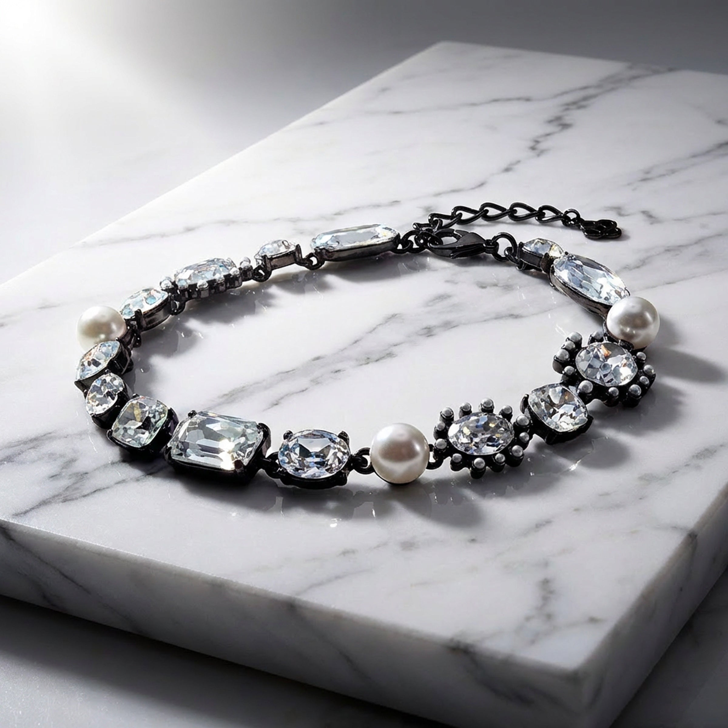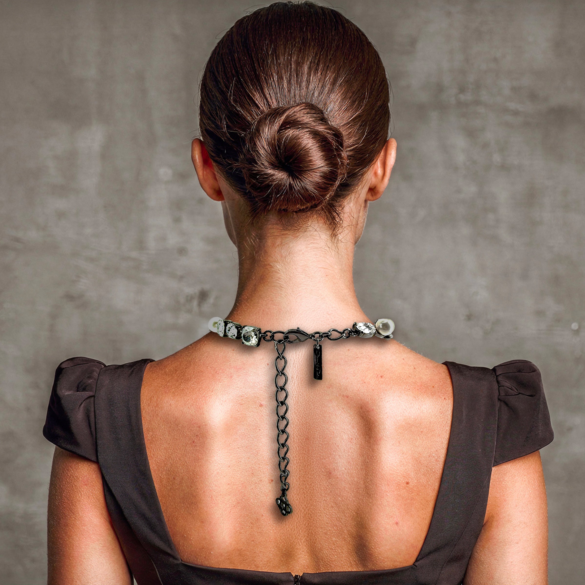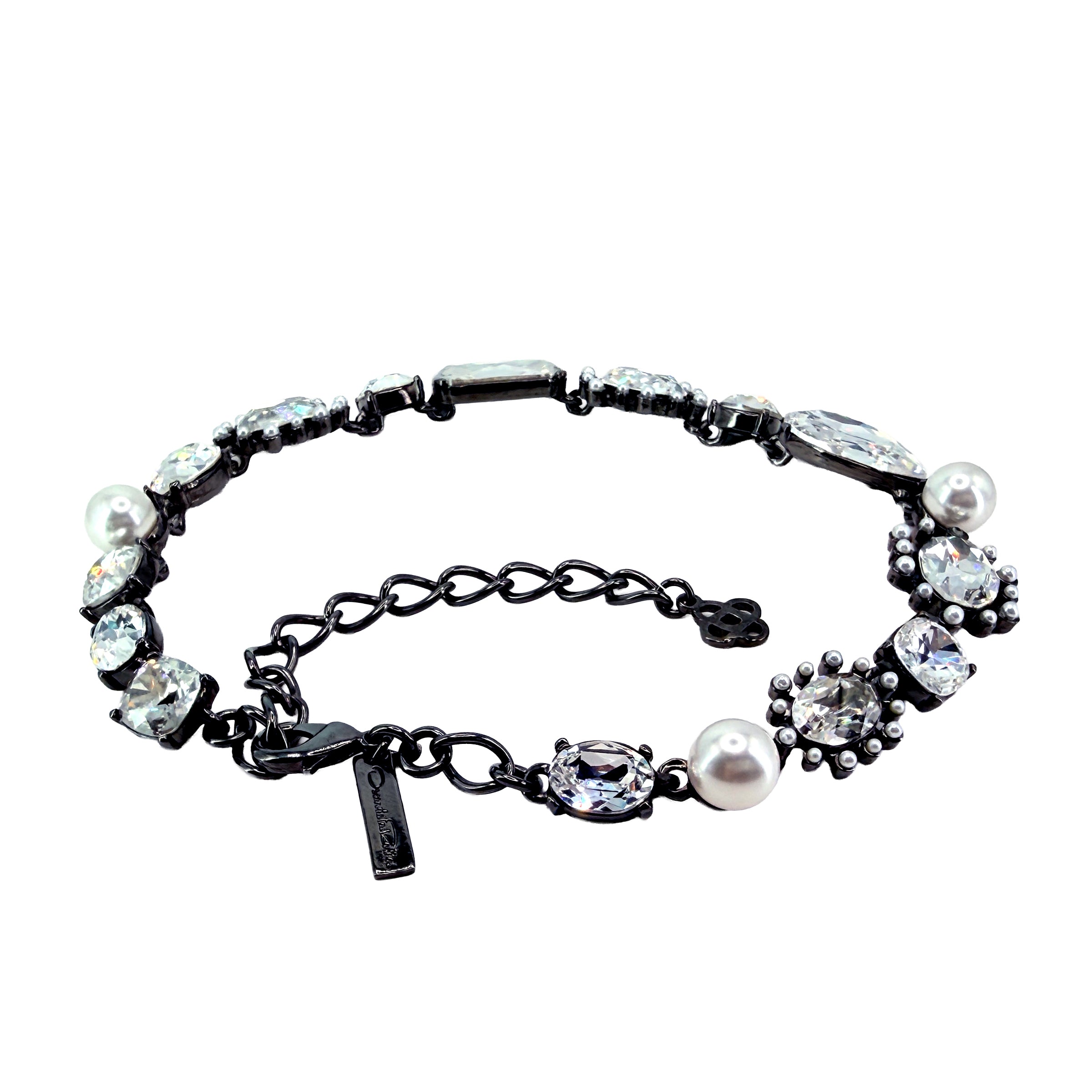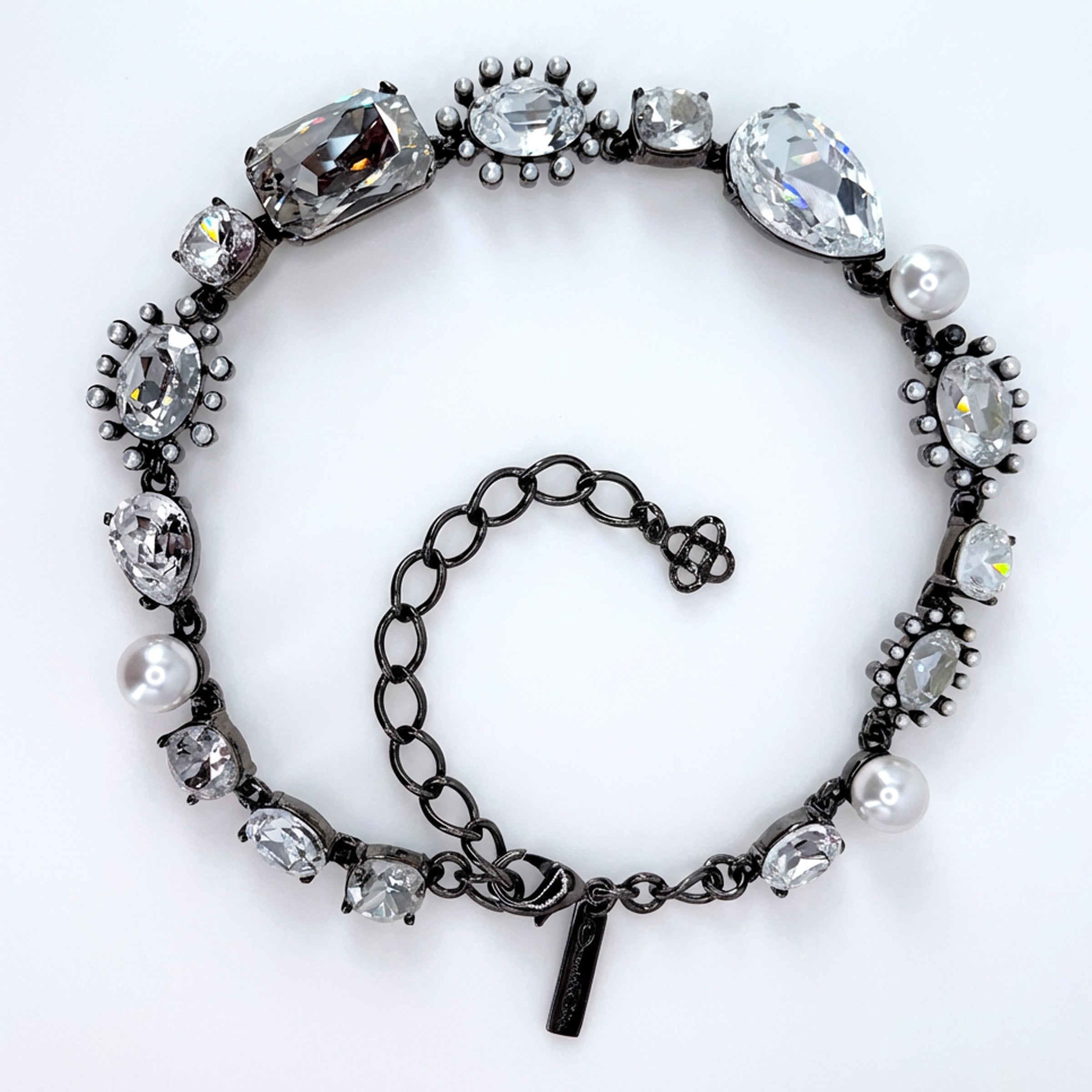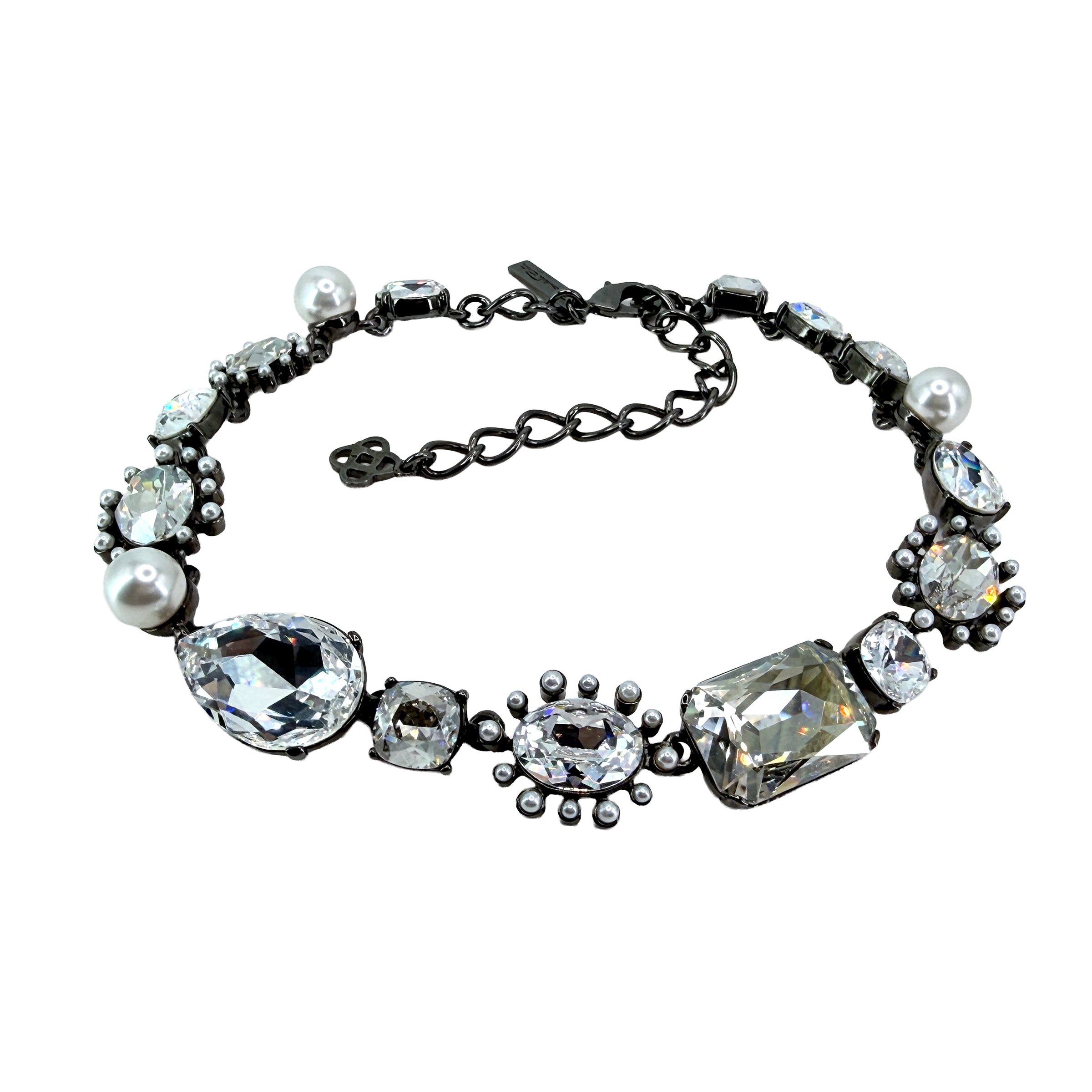 Oscar de la Renta hematite plated crystal pearl multi-stone statement necklace with adjustable length. Luxury designer jewelry. Bold statement piece. Made in USA.