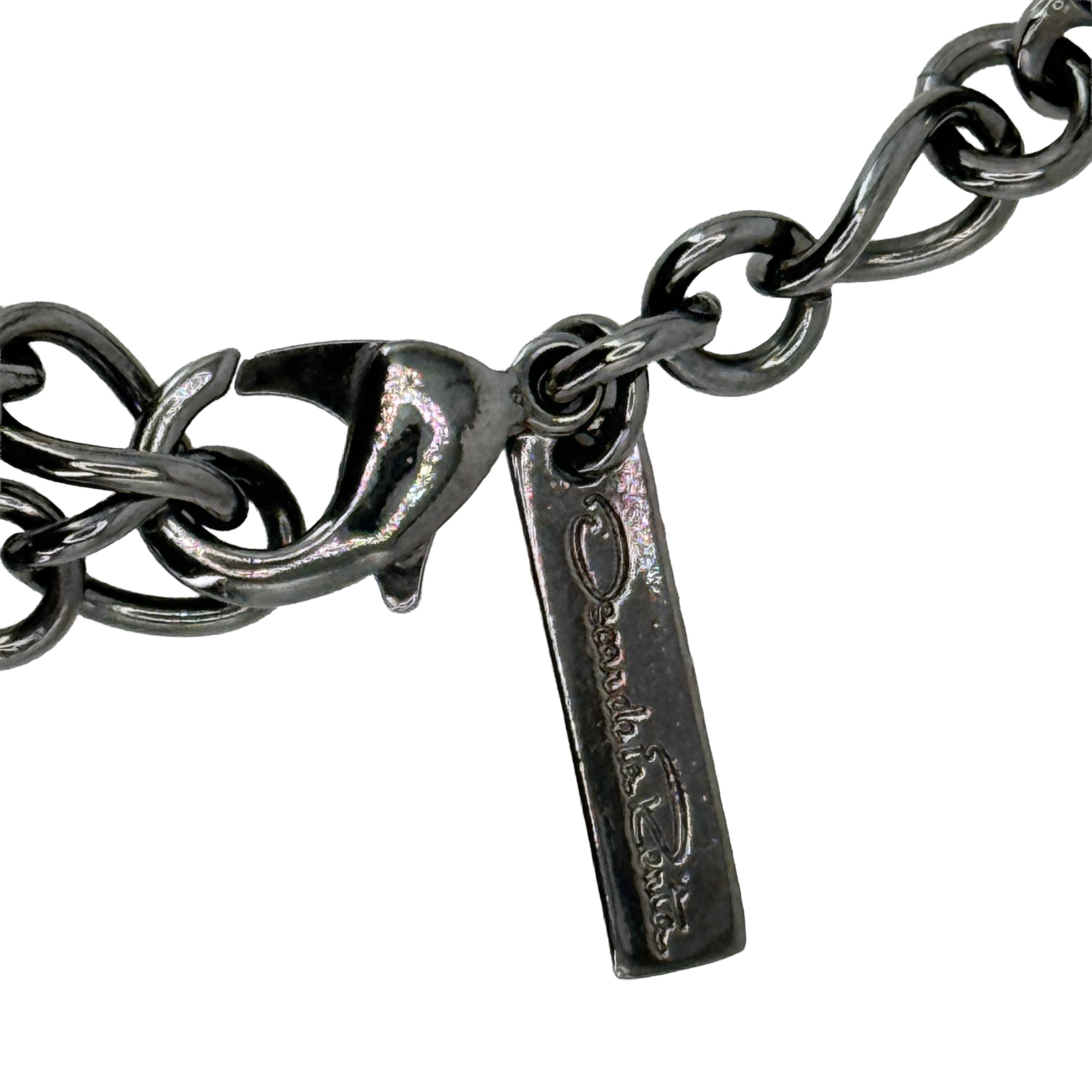 This Oscar de la Renta collar measures 15 inches with 4.5-inch extender for versatile 15-19.5 inch wearing options. At 105 grams total weight, this designer necklace delivers substantial presence suited for collectors of bold luxury jewelry. The cool hematite finish and sparkling crystal combination create striking contrast perfect for evening occasions.