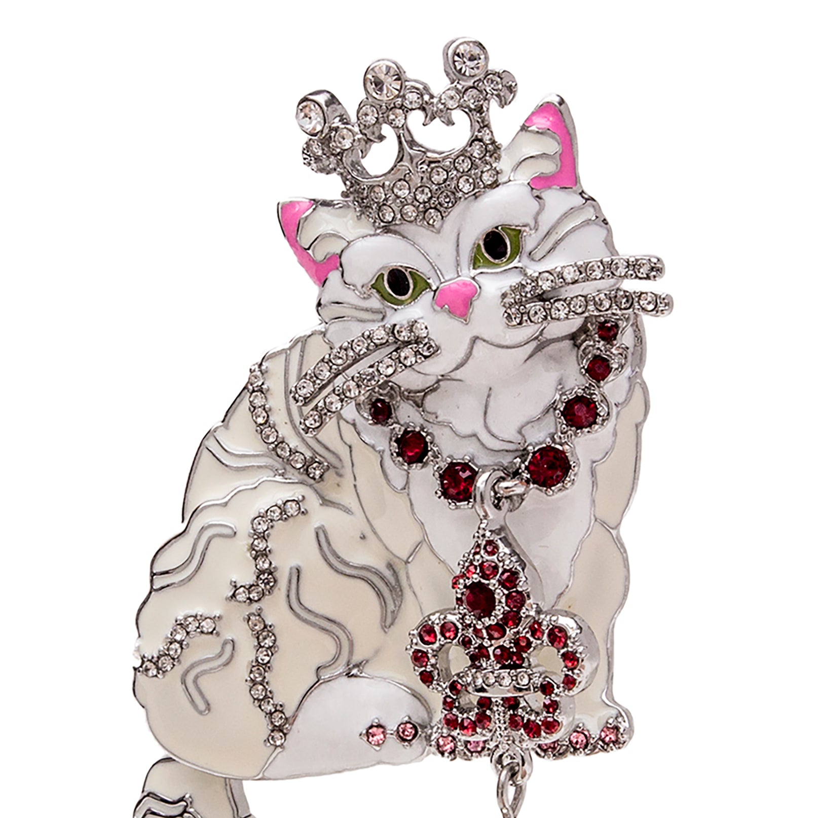 Ritzy Couture Princess Kitty Brooch and Pendant. Bring a little regal feline fabulousness to any outfit with this pretty Princess Kitty Silvertone brooch and pendant from the Ritzy Couture collection. This White kitty features a Silvertone and enamel design with a real Silvertone brass tassel drop, a moveable tail and Crystal, Siam Red, and Rose Pink color crystals throughout. Designed by Esme Hecht - Original Creator and Designer of Lunch at The Ritz™.
